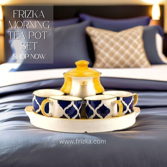 Frizka Blue Moroccan Tea Set with Kettle, Hand Painted Ceramic Tea Kettle Set with 4 Cups(150ml), 1 Kettle(700ml), 1 Tray (6 Pieces, Multicolor, Microwave Safe)