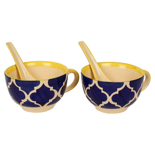Frizka Ceramic Soup Bowls with Spoons Set of 2, Microwave and Dishwasher Safe, Food Grade Material, Pattern Soup Bowl with Matching Spoon, 300 ml, Blue