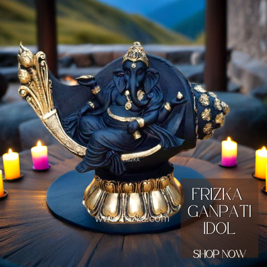 Frizka Shankh Ganesh Murti Lord Shankh Ganesh Ji Statue Hindu God Ganesha Ganpati Sitting Idol Sculpture Good Luck & Success (Black & Golden) | Decoration & Gifts 9 Inch | Black & Golden