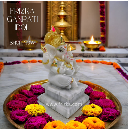 Frizka Marble Dust Ganesha Ganpati Vinayaka Idol Statue Ganesh ji Murti for Pooja Room, Living Room Home Office Decor Gifting Item (White, 5.5 inch Height)