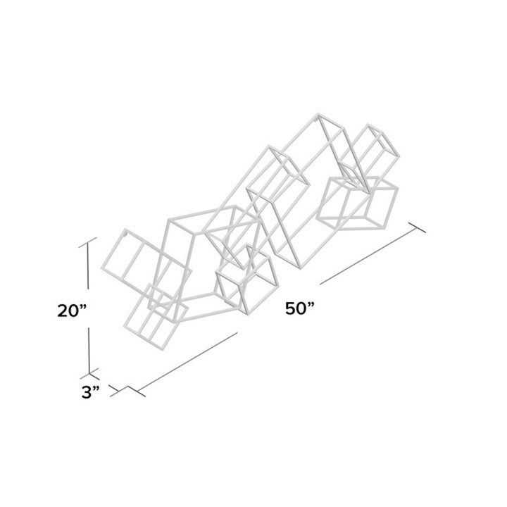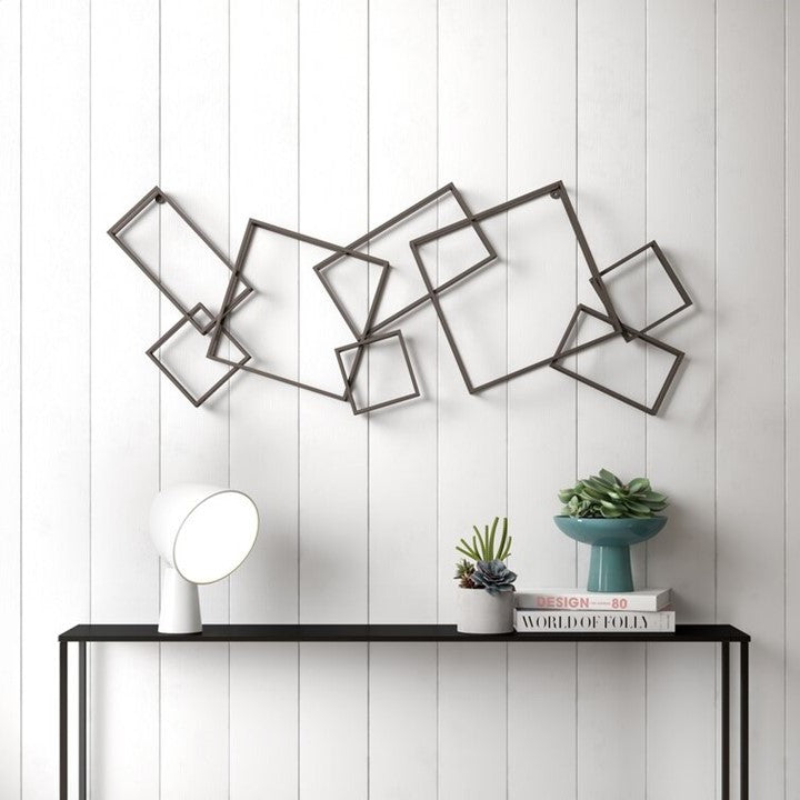 This striking geometric wall decoration adds a captivating touch to hallways or living rooms. Crafted from metal with a sleek dark gray coating, it showcases eight intersecting open-frame squares and rectangles, creating an intriguing abstract design. Versatile in orientation, it can be hung horizontally or vertically to fit your area and effortlessly complements industrial or contemporary interiors. Customize it by placing photos within the frames for a unique display, or leave it bare to make a statement on its own. With dimensions of 20'' in height and 50'' in width, this piece commands attention wherever it's placed.