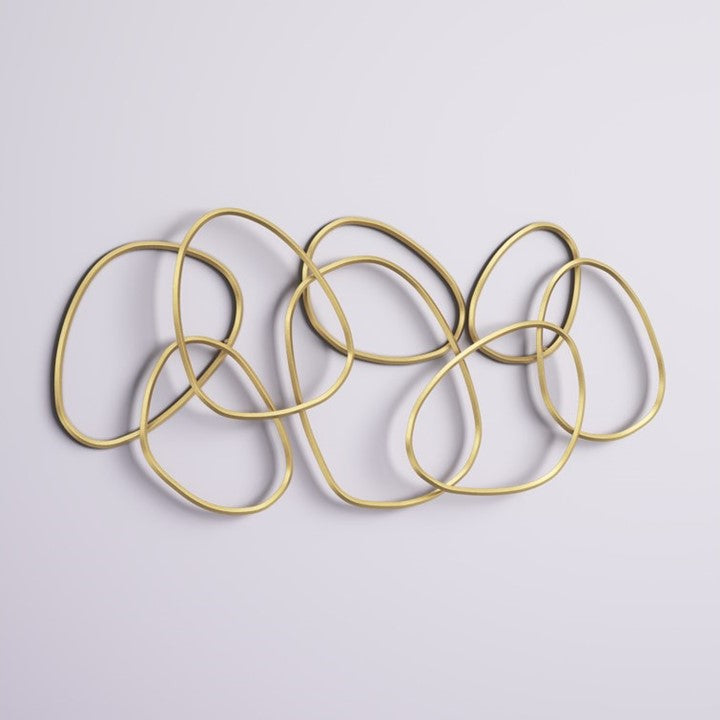 This contemporary and glamorous abstract wall art piece captivates with its design. Fashioned from iron and finished in a luminous gold hue, it showcases an arrangement of overlapping, irregular-shaped circles of various sizes, creating a sleek and multi-dimensional appearance ideal for your living room or entryway. The subtle distressing adds just the right touch of industrial charm while maintaining a luxurious ambiance. Additionally, its open design allows your wallpaper to peek through, adding depth to your space. Measuring 43'' wide and 22'' high, this piece is perfect for accentuating your wall.
